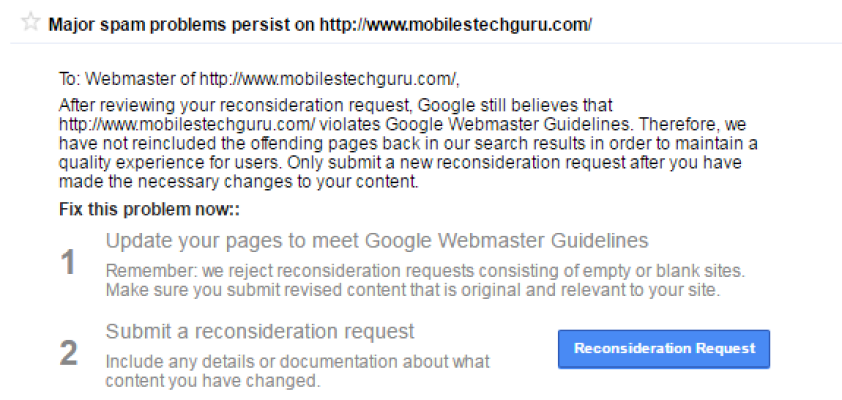 Before contact SpiderClickz team, the website owner try to solve the issue by submiting the reconsideration request theirown without knowing the reason why google banned them from the search engine. Inorder to maintain the quality experience user, google didnt reincluded the pages back to search result. Website owner received a mail from webmaster stating :"Major spam problems persist on www(dot)mobilestechguru(dot)com ".